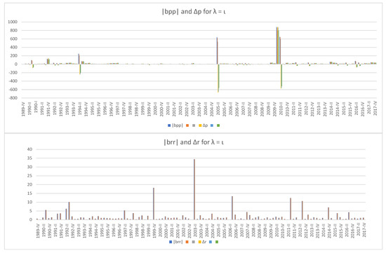 Figure 3 shows the market instability indicator and default elasticity of HNISH from 1960 Q3 to 2017 Q4. The maximum D/W ratio is chosen as the three quartiles of the historical D/W ratio from 1960 Q1 to 2017 Q4,6 thus we have three sets of and . We can see frequent occurrence of negative from 2006 Q3 to 2015 Q4. The Case–Shiller National Home Price Index (SP Dow Jones Indices 2018) recorded a pre-crisis historical peak in 2006 Q2, declined with volatility until 2012 Q1, then started rebounding to reach an all-time high level as of February 2018. The biggest chunk of wealth for ordinary Americans being their homes, it seems justifiable that the decreasing home value implies increasing financial instability. This is indeed true from 2006 Q3 to 2011 Q3, during which not only the real estate market but other invested asset classes experienced heavy loss. In other words, Americans got poorer together during that period. Note that the mathematical threshold that determines financial stability and instability is 1, but as can be seen from the figures below the size of the indicator works as the determinant: the bigger the market instability indicator, the more severe the financial instability.