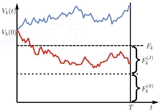 We extend the Merton model to a multivariate scenario with two creditors and K correlated obligors with asset values or economic states , at time t. Each obligor may hold a credit contract from each creditor. In the Merton model, the asset values are estimated by the stock prices of the corresponding obligors. Thus, we assume that all K obligors are companies that can be traded on a stock market. We claim that the asset values follow a geometric Brownian motion. Furthermore, we assume subordinated debt where at maturity time T the senior creditor is paid out first and the junior subordinated creditor is only paid out if the senior creditor regained the full promised payment. Suppose each obligor has to pay back the face value at maturity time T. We consider large time scales such as one year or one month. The face value of each obligor is composed of the face value of the senior creditor and the face value of the junior subordinated creditor , which is . A default occurs if the asset value drops below the face value i.e., for at least one obligor. The severity of the loss depends on the value of the obligors at time maturity. For , the default is completely defrayed by the junior subordinated creditor meaning that the senior creditor does not incur any loss. The senior creditor will incur a loss while the junior subordinated creditor will sustain a total loss only if t. A visualization of the underlying process for a single asset is shown in Figure 1.