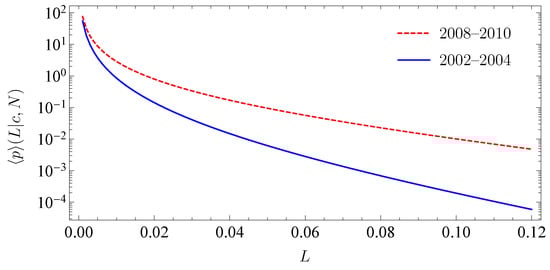where is the Bessel function of second kind and of order (). is the covariance matrix averaged over the whole data interval considered and N controls the strength of the fluctuations around the average covariance matrix . The smaller N, the larger are the fluctuations. In this notation and all further notations, we omit the time dependences of r and V. Hence, the heavier the tails of the distribution (12), the smaller the N. The distribution is very non-Gaussian and differs considerably from . Since we assume all credit contracts to have the form of zero coupon bonds, we consider our return intervals to have the same length as the maturity time, i.e., .