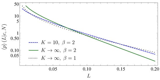 They are in accordance with the simulation results in (). The portfolio loss correlation is a monotonic function of the asset correlation c and, for a fixed asset correlation, we find with increasing K an increasing portfolio loss correlation. Depending on the number of companies, the portfolio loss correlation is a convex function (namely, ) or a concave function (). However, we emphasize that these results are subject to the second order approximation, which yields better results the larger the K. Large numbers of K lead to very high loss correlations. This confirms that, even without average asset correlation , the loss of one large portfolio serves as a forecast for another large portfolio.