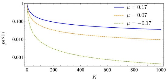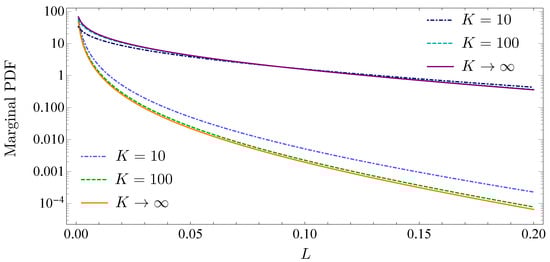 A different situation appears when we consider a portfolio of finite size and another infinitely large one. Due to the high asymmetry of the market shares of the portfolios, we solely examine two disjoint portfolios. Say, portfolio one is the finite one with companies. Then, the matrix element in Equation (59) scales with K and converges to one. By calculating the limit , only one function emerges, and, by using property (42) of the function, we find