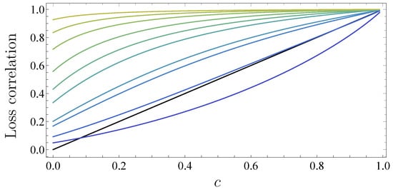 Portfolio loss correlation on a linear scale depending on the asset correlation c. Both portfolios are homogeneous and have the same size. The market size K ranges from 2 (blue) over 4, 8, 10, 20, 30, 50, 100, 200 to 500 (green). The bisecting line is shown in black.
