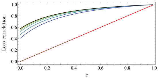 Portfolio loss correlation as a function of asset correlation c on a linear scale. Portfolio one is of fixed size and the market size K ranges from 30 (blue) over 50, 100, 200 to 500 (green). The limiting curve is shown in black and the bisecting line is shown in red.