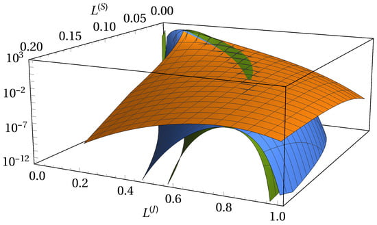 From Equation (36), we see that functions only appear under the condition . For , we have no default at all. The only contribution to the distribution stems from the last integral in Equation (36), leading to a peak at the origin. This peak is associated with the absence of default neither on the junior nor on the senior level. The probability therefore is