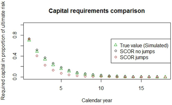 We then compare them with the capital obtained with existing risk estimation methods. In particular, our results show that the commonly used Merz–Wüthrich method can lead to very wrong estimates in cases where its assumptions are not fulfilled (which is the case for our example). This is due to a multiplicative error assumption. Instead, our example has an additive error propagation as is often the case in practice for many different types of insurance contracts. Indeed, reserving actuaries often estimate the reserves using the Chain–Ladder method for mature underwriting years and the Bornhuetter–Ferguson method (Bornhuetter and Ferguson 1972; Schmidt and Zocher 2008) for young underwriting years. In Mack (2008), Mack has used an additive model for estimating the prediction error of reserves. Hence, claim triangles which have dominant young underwriting years will manifest an additive error propagation structure. The method proposed by Ferriero in Ferriero (2016) (Capital Over Time method, i.e., COT) gives instead good estimates even when its assumptions are not fulfilled and so proves to be more robust than the Merz–Wüthrich method. Our example shows the need of alternative methods beyond Merz–Wüthrich.