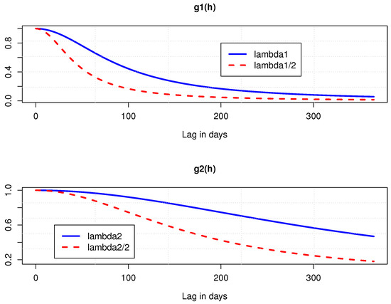 It may be shown that this autocovariance function is closely related to the one of an Ornstein–Uhlenbeck process. Details are provided in Appendix A. In later developments, we consider d exponential autocovariance functions for Z t ( k ) parameterized by λ = { λ 1 , , λ d } R d , + and denoted by: