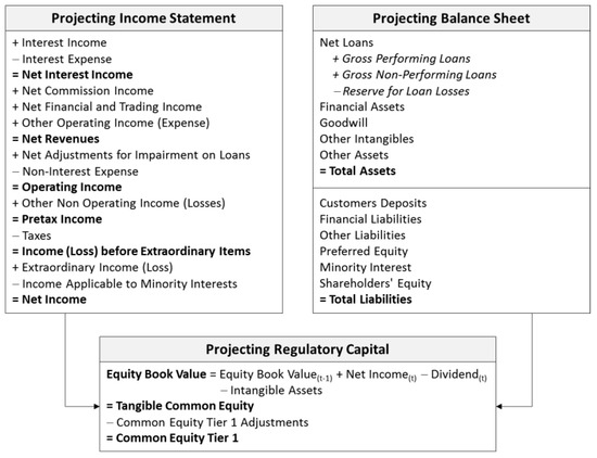 The Equity Book Value represents the key figure for determining a bank’s solvency and in each period, it is a function of its value in the previous period, Net Income/losses and dividend payout. We consider Net Income to be conditioned by some elements of uncertainty, the dynamics of which can be described through a series of stochastic processes with discrete parameters, of which we assume that the information necessary to define them is known. In the following Section 3.3, we provide a brief description of the stochastic variables considered in the model. Of course, the Net Income dynamic will also affect, through the Equity Book Value, liabilities, and assets in the bank’s balance sheet; here below, we provide a description of the main accounting relationships that rule the forecasting model. We consider that a bank’s abridged balance sheet can be described by the following identity:
