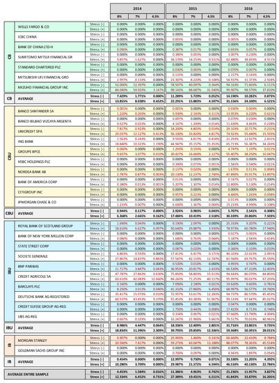 | 42 | Applying a 1.5% net loss rate (on 2013 net risk assets) to the 2013 CET1, the following banks would have not reached the 5.5% CET1 threshold: Credit Agricole, BNP Paribas, Deutsche Bank, Groupe BPCE, ING Bank, Societe General. |