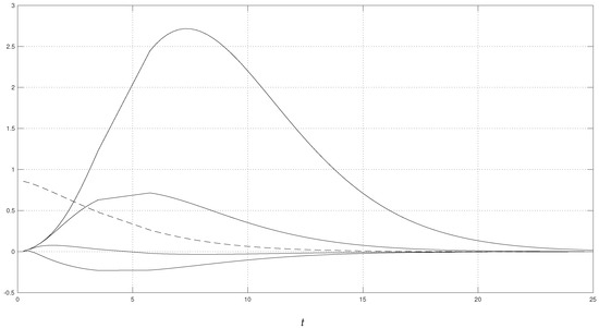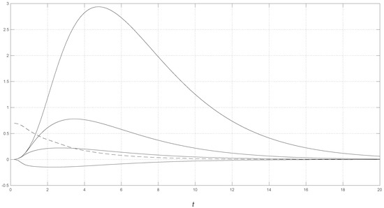 For the numerical illustration, we fixed , , and . The results are shown in Figure 1. The dashed curve shows the saddlepoint approximation to the s.f. (see (22)) for all relevant values of t. The four solid curves of Figure 1 show the approximation to the stability , for the perturbation points , and for relevant values of t. The highest curves correspond to the largest values of x. This is what we would have expected. A large perturbation point x yields a large increase of the upper tail probability, and thus a large value of the stability. A vanishing perturbation point x yields either a small increase or a decrease of the upper tail probability, and thus a small value of the stability. We should note that the numerical computation of these curves is very fast. Thus, the proposed approximation to the s.f.s. inherits the well-known computational efficiency of the saddlepoint approximation. Any purely numerical technique (e.g., Monte Carlo simulation) would be computationally intensive and thus slower.