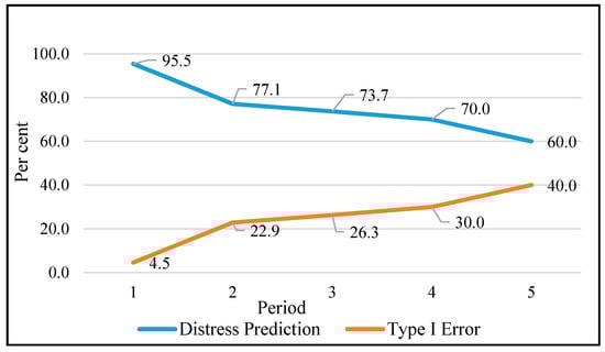 The results based on prediction for N period ahead is plotted in Figure 2. It is observed that, as we move farther in time, the Type I error is increasing and correct prediction of distressed firms is falling. It is noted that in fifth period ahead the Type I error rises to as high as 40%.
