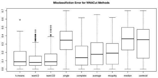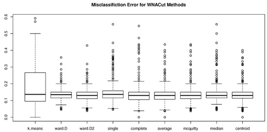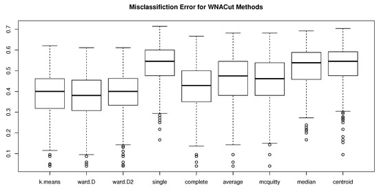 As mentioned, our proposed clustering procedure is a two-stage procedure, as shown in Algorithm A1. However, there is no information related to the choice of clustering method for the second stage in this particular situation revealed. Hence, a simulation study is designed in this section to compare the performance of the second stage clustering method in WNACut with that of a list of commonly used clustering methods, including the classical k-means method and hierarchical clustering procedure with Ward’s minimum variance method (considering both Ward’s criterion and Ward’s criterion squared, the results are denoted as Ward.D2 and Ward.D, respectively), single linkage method, complete linkage method, average linkage method, McQuitty’s linkage method, median linkage method, and centroid linkage method. The performances are measured in two metrics: the misclassification error (ME) described in Verma and Meilă (2003) and variation in information (VI) introduced in Meilă (2003). Both criteria tend to be smaller if the resulting clusters are more similar to the K known clusters.