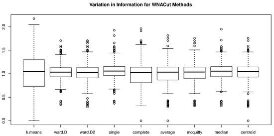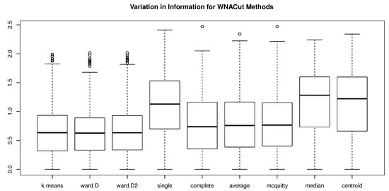 Box plots of simulated VIs using various clustering methods in the second stage of WNACut for .