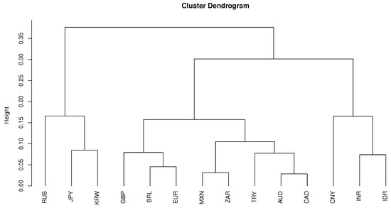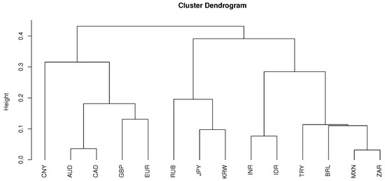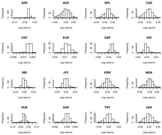 In this section, we apply the proposed procedure on the log-returns of foreign exchange rates with respect to US dollars from Group of 20 (known as G20). Since US dollar is used as the underlying currency, there are 19 time series of exchange rates in total. The exchange rates of France, Germany and Italy are excluded from our analysis due to their perfect linear correlation with euros, which results in 16 time series of exchange rates available for our clustering analysis1. The data were collected weekly from 5 September 2012 to 17 August 2016, covering 207 × 16 active observations during these four years, which can be downloaded from “PACIFIC Exchange Rate Service”, 2016, by Werner Antweiler, University of British Columbia. The descriptive statistics and histograms of observations for the 16 currencies are given in Table 3 and Figure 7.
