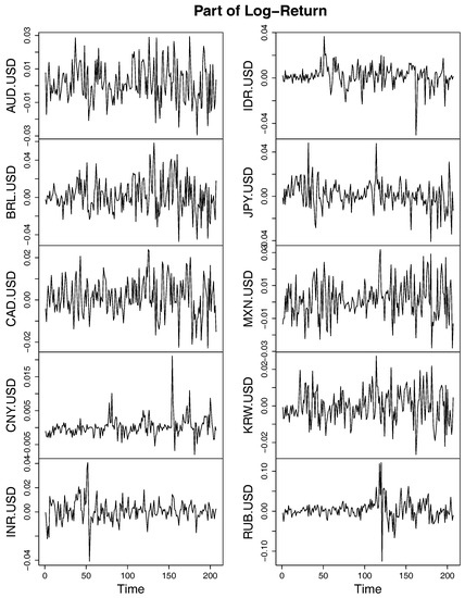 For each series of the exchange rates, the log-returns are obtained by taking logarithm of the fraction between two consecutive weekly exchange rates, part of which are shown in Figure 8. To eliminate the potential autocorrelation and heteroskedasticity of the log-returns, a univariate generalized error distribution (GED) ARMA-GARCH model is applied to each time series of log-returns and the fitted standardized residuals are extracted for the purpose of clustering.