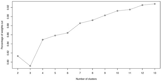 Using the fitted parameters and , we obtain the fitted tail order of maximal dependence as well as the fitted WLTMD . Then, we apply the WNACut algorithm for the first stage of the clustering procedure and Ward1 method for the second stage on the affinity matrix constructed by the ( 196) s for , respectively. The total weights for WNACut is k, and the percentages of weights cut of the total weights against k are shown in Figure 9, which indicates that a relatively stable clustering result is obtained when the number of clusters .