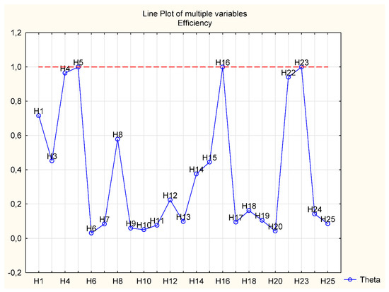 As an example of the dual model, we specify the objective function and conditions for hotel H1—DMU1. With the use of selected ratios, we formulated the following dual linear programming model: