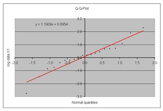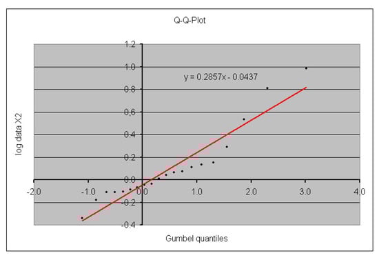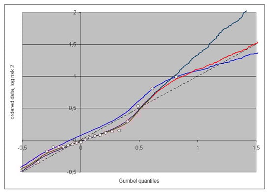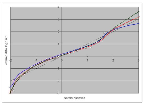 For simplicity, we concentrate on the example data set given by () because it has also been used as a data basis in several papers on partition-of-unity copulas ( , , ). Here, we have and . The marginal distributions were estimated by Q-Q-plots as normal and Gumbel for the log risks, i.e., as lognormal for the first risk and Fréchet for the second risk (see Table 1 and Figure 1 and Figure 2).