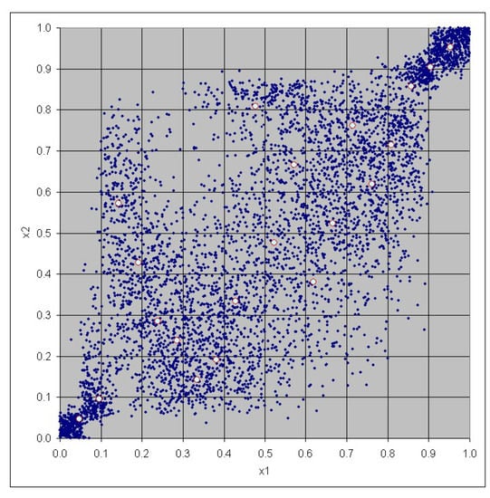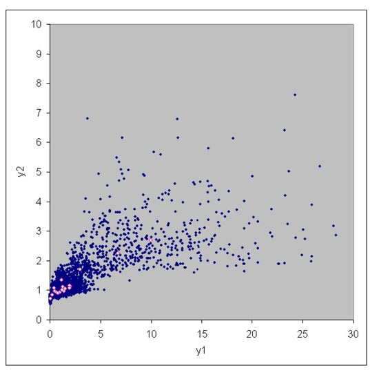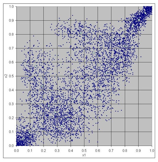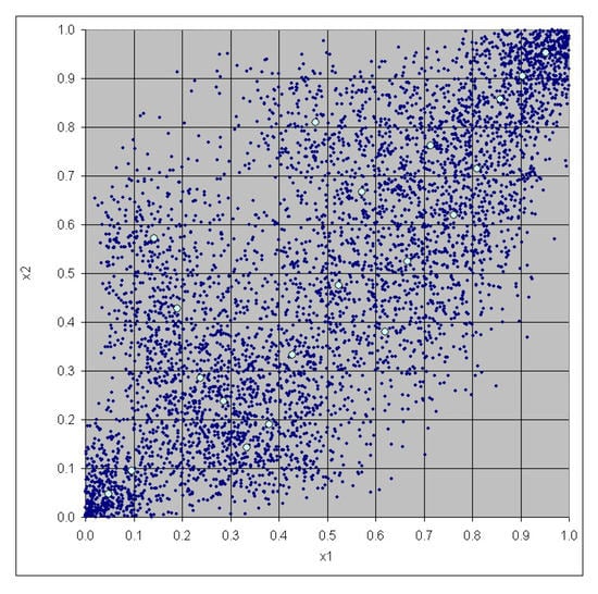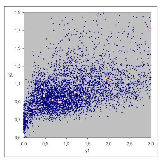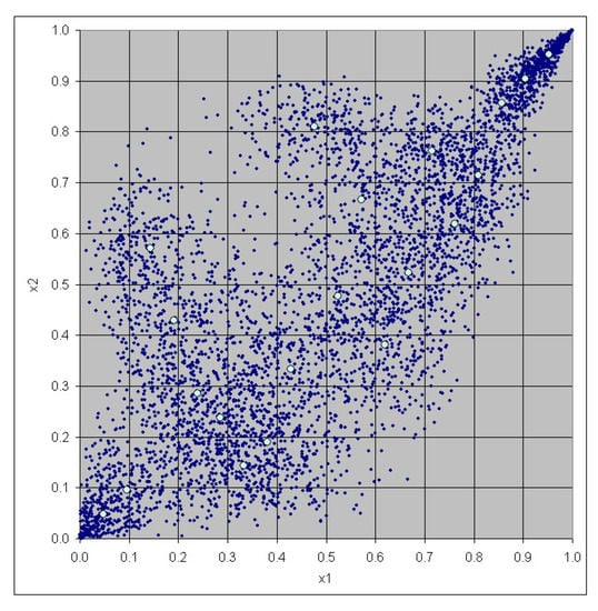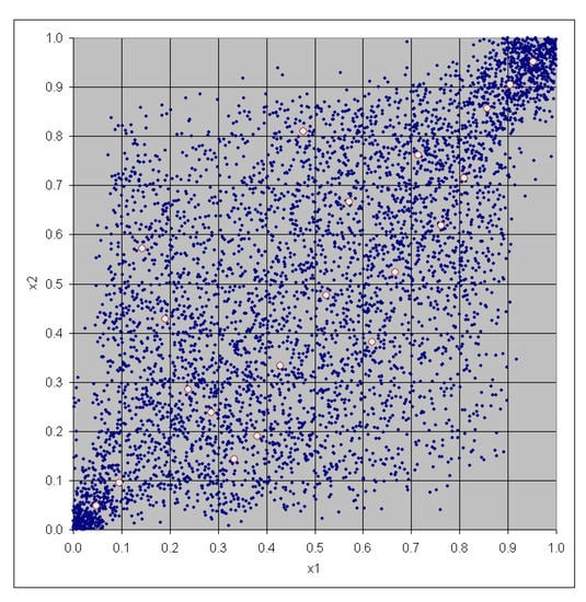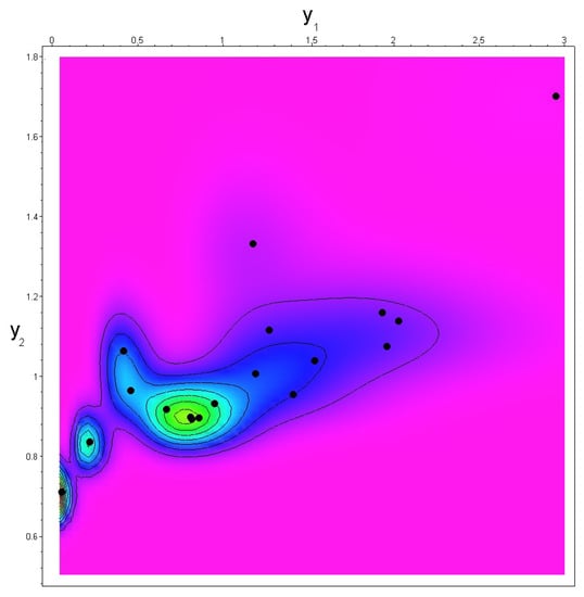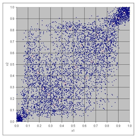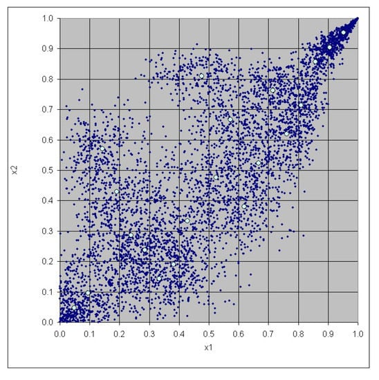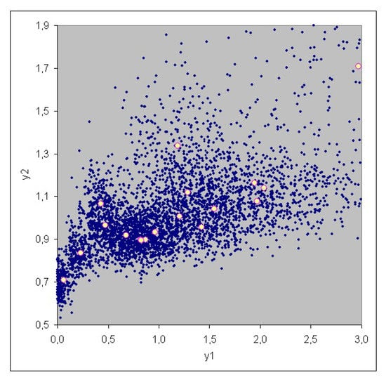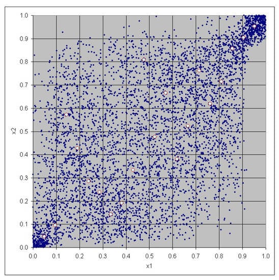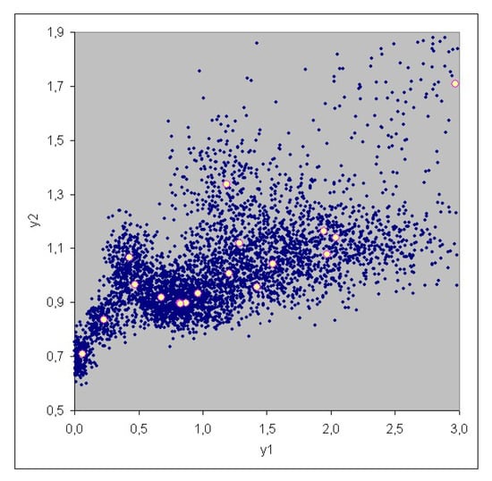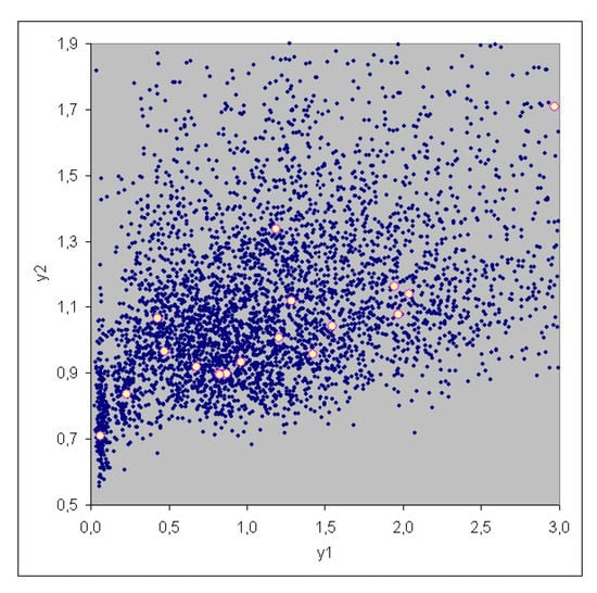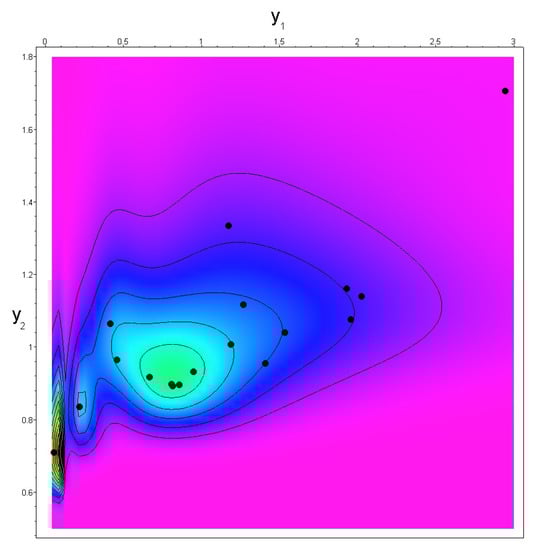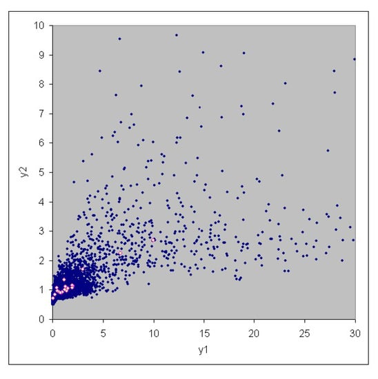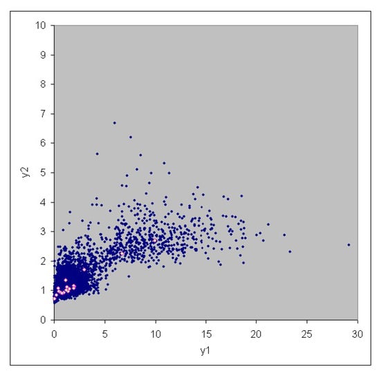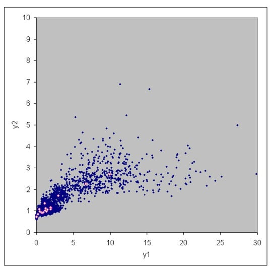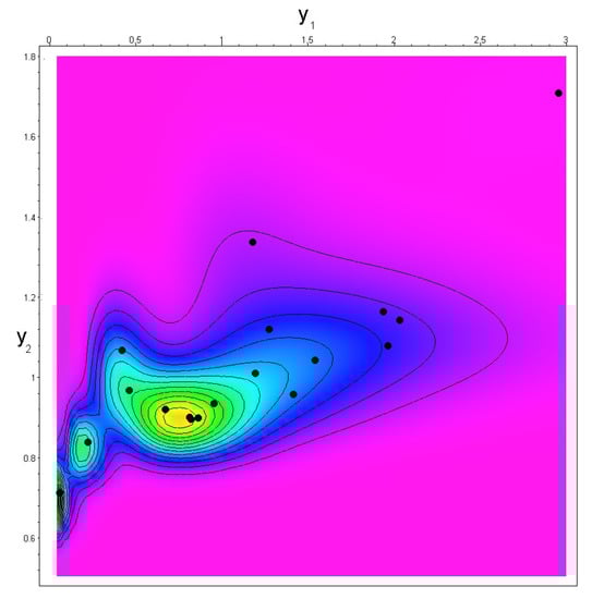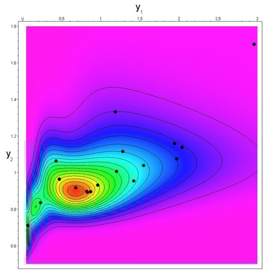 The graphs in Figure 3, Figure 4, Figure 5, Figure 6, Figure 7, Figure 8, Figure 9, Figure 10, Figure 11, Figure 12, Figure 13 and Figure 14 show scatterplots for various Monte Carlo simulations with the algorithm described above, for several integer values of m, and graphs of the contour plots of the estimated scenario density . The original data are marked by circles. The simulation size was 10,000 in each case. For comparison, we also present scatterplots for a Monte Carlo simulation with a certain adaptive kernel density estimator, where, for the first risk, we used pointwise lognormal densities and, for the second risk, Fréchet densities matching their modes with the data points (cf. (), chp. 6.6). In particular, the kernel density estimator used here is given by