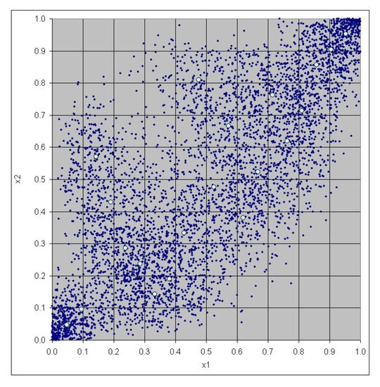 Seemingly, is the randomized density of a multivariate distribution (scenario distribution) that “interpolates” the original observations of the risks under investigation. This follows by similar arguments as (), pp. 8–9 or (), Remark 2.2.2 since, obviously, is the randomized density of a d-dimensional distribution with cdf , and is the density of the cdf defined by