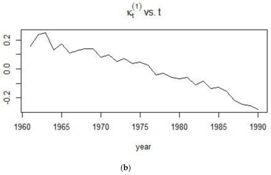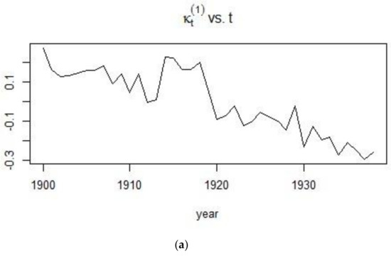 Figure 8 and Figure 9 show the evolution of the two time-dependent parameters of the CBD model for the two periods under consideration. For the 1900–1938 period, the first mortality index is seen to be declining over time despite experiencing a few jumps which may be attributed to the First World War. It has the same interpretation as the APC mortality index and the Lee-Carter mortality index and therefore exhibits a similar pattern to these parameters.