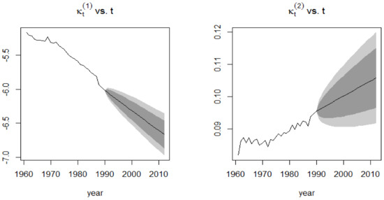 In Figure 10 and Figure 11, the forecasts of the mortality indices show the same pattern for both testing datasets under consideration despite showing more uncertainty for the first half of the 20th century due to the events that occurred during that period of time.