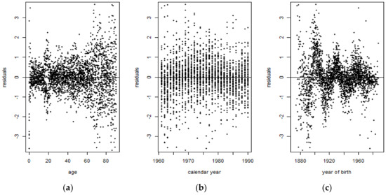 Lee-Carter residuals plotted against (a) age, (b) calendar year, and (c) year of birth for the 1961–1990 period.