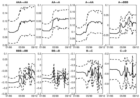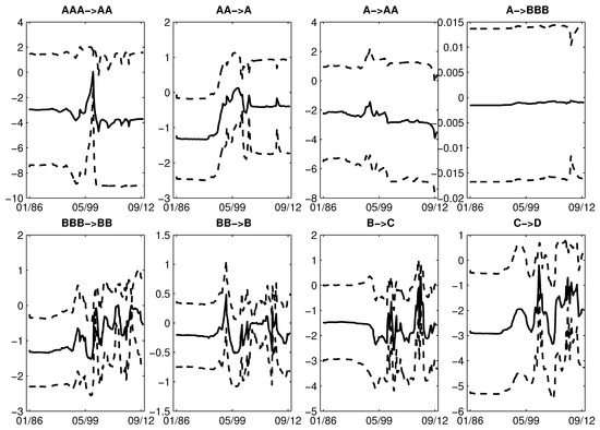 (solid) and their 95% confidence bands (dotted) for firms’ distance to default. Note that the values of for the corresponding transitions (from left to right and top to down) are 0.069, 0.039, 0.075, −0.004, −0.102, −0.204, −0.426, and −0.378, respectively.