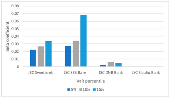 Figure 2 shows the beta coefficient sensitivity analysis to the VaR parameter. The sensitivity analysis with different VaR percentiles (5%, 10% and 15%) showed the same results for JSC Swedbank and JSC SEB Bank; in all cases, they had higher systemic risk than the other banks.