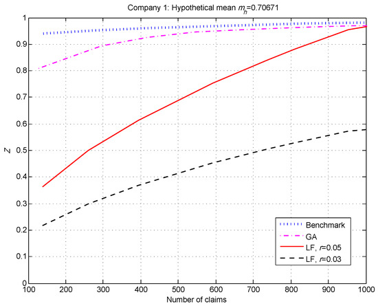 Figure 2. We contrast the Benchmark, GA, and LF credibility factors for “company” (risk class) 1, whose hypothetical mean is .