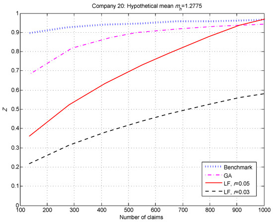 Figure 3. We contrast the Benchmark, GA, and LF credibility factors for “company” (risk class) 20, whose hypothetical mean is . - The exception to Observation 1 occurred when the hypothetical mean was close to the overall population mean —see Figure 4. This is not surprising, as the benchmark factor is the relative frequency in 2000 trials that the observed A/E ratio is closer to the true hypothetical mean than the overall population mean . When is very close to , it is unlikely that will land closer—that is, the event is unlikely, resulting in a smaller benchmark Z.