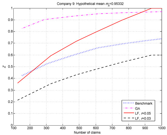 Figure 4. We contrast the Benchmark, GA, and LF credibility factors for “company” (risk class) 9, whose hypothetical mean is . - For our simulated data set, and for the real data in (Klugman et al. 2009), the GA method produced significantly higher credibility factors at low numbers of claims than the LF method with . Of course, the difference was even more pronounced when we chose the Canadian standard .