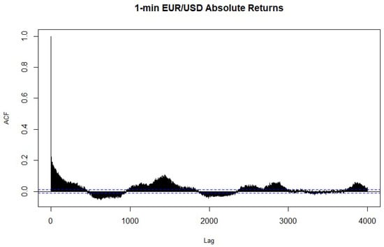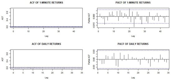 It can be seen in Table A1 that the mean for both series hovers around 0 which in fact coincides with past studies on high-frequency financial returns. Moreover, the skewness values for both return series are negative which may imply that these series experience more negative shocks than positive shocks and that there is a higher probability of obtaining a negative return. All kurtosis values being greater than 3, which is the kurtosis of any univariate normal distribution, imply that return distributions have thicker tails and sharper peaks at the centre as compared to a normal distribution. When comparing the degree of kurtosis and skewness for the 1-min returns (18.31108, −0.38839) with that of the daily returns (4.90965, −0.08208), it can be established that the kurtosis and the skewness values are much higher for the 1-min returns. This suggests that both the kurtosis and the degree of skewness increase with the frequency at which the data is recorded, thus confirming the findings of (). The high kurtosis value for the 1-min returns is yet another stylised fact of high-frequency financial returns. The minimum value for the daily return occurred during the global financial crisis.