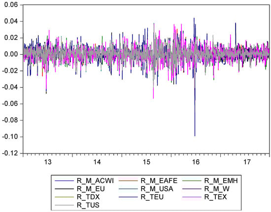 The paper takes the log of the ten series and arrives at their respective daily returns. These return series are evaluated for their stationarity, and all further analysis are performed on their daily return values i.e., the log of the ten series. These variables are named as r_m_w, r m_acwi, r_m_usa, r_m_eafe, r_m_em, r_m_eu, r_ tdx, r_tex, r_tus, and r_teu. Data analysis starts with the computation of the descriptive statistics, which includes the presentation of mean, median, standard deviation, skewness, kurtosis, Jarque-Bera statistic, and coefficient of variation. The paper then proceeds with the econometric analysis, along with the respective line graphs of the series. Augmented Dickey-Fuller (ADF) unit root test is applied to examine whether or not the series are stationary. The following equation explains the basic concept of the unit root testing: