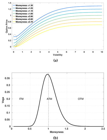 Vega tends to be zero in certain regions of deep ITM or OTM options. (a) Option price vs. volatility; (b) Vega vs. Moneyness.