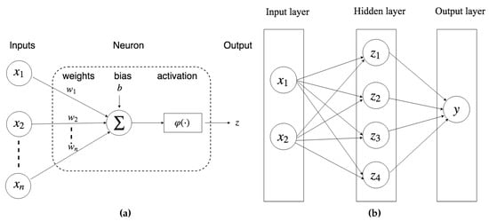 Illustration of a MLP configuration. (a) A neuron; (b) An example of MLP.