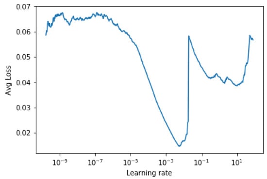 We employ the method proposed in Smith (2015) to determine the lower and upper bound of learning rates. The method is based on the insight of how the averaged training loss varies over different learning rates, by starting with a small learning rate and increasing it progressively in the first few iterations. By monitoring the loss function against the learning rate, it is shown in Figure 3 that the loss stabilizes when the learning rate is small, then drops rapidly and finally oscillates and diverges when the learning rate is too large. The optimal learning rate lies here between and , where the slope is the steepest and the training loss reduces quickly. Therefore, the learning rate is reduced from to in our experiments.