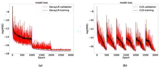 The history of training and validation losses for the Heston model. (a) Losses with decaying learning rates; (b) Losses with cyclical learning rates.