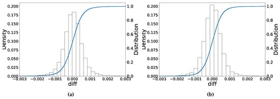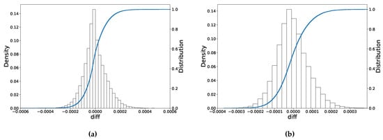 The error distribution of the implied volatility: The combined Heston-ANN and IV-ANN techniques for implied volatility. (a) Case 1: The error distribution; (b) Case 2: The error distribution.