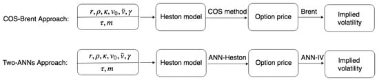 We design two experiments to illustrate the ANN’s ability of computing the implied volatility based on the Heston option prices. In the first experiment, the ground truth for the implied volatility is generated by means of two steps. Given the Heston input parameters, we first use the COS method to compute the option prices, after which we use Brent’s method to compute the Black-Scholes implied volatility . The machine learning approach is also based on two steps, as shown in Figure 10. First of all, the Heston-ANN is used to compute the option prices, and, subsequently, we use IV-ANN to compute the corresponding implied volatilities. We compare these two approaches as follows.