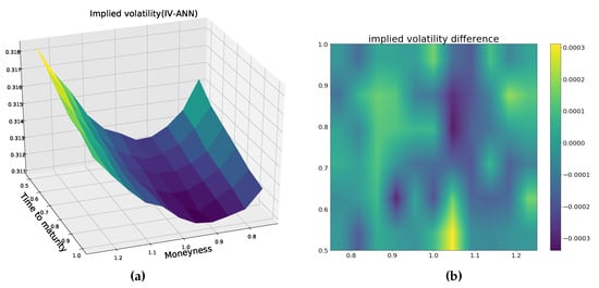 (a) Heston implied volatility surface generated by IV-ANN. (b) Heston implied volatility difference between Brent’s method and IV-ANN.