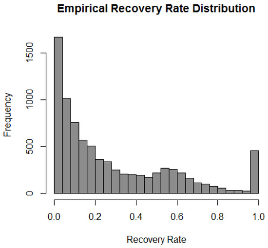RR mainly lies in the interval [0, 1] and typically has high concentrations at the boundary points 0 and 1. It is possible for RR to be negative if recoveries are less than administration costs, , and greater than 1 if recoveries exceed exposure plus administration costs, . Typically, however, RR is truncated within the interval [0, 1] when developing LGD models.