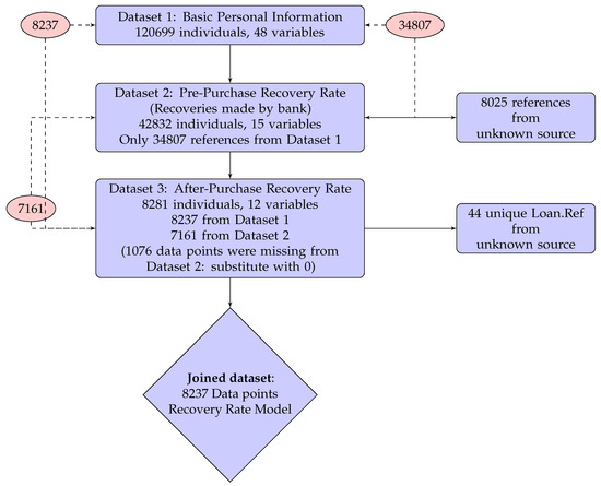 Figure 2 shows how the data were joined. There are 8237 data points presented in Dataset 3, but only 7161 individual historical collection information are recorded in Dataset 2. In these cases, there are no historical recoveries by bank, i.e., no calls, contacts, visits or payments for the remaining 1076 individuals. Therefore, a value of 0 was assigned to aggregate recoveries in Dataset 2 for the remaining 1076 individuals. The modified Dataset 2 was then joined to Datasets 1 and 3 by the unique key Loan.Ref and we obtained a table of 8237 data points with 61 variables.