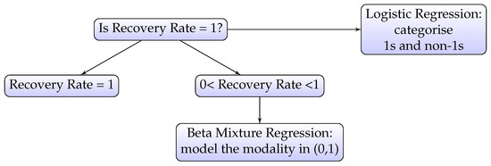 After calculating for the interval (0, 1) using the beta mixture model, the boundary 1 needs to be taken into consideration using a logistic regression model. From the decision tree defined in Figure 4, the logistic regression can provide the estimates at the first leaf node: . Then, the overall expectation of RR y∈ (0, 1] is