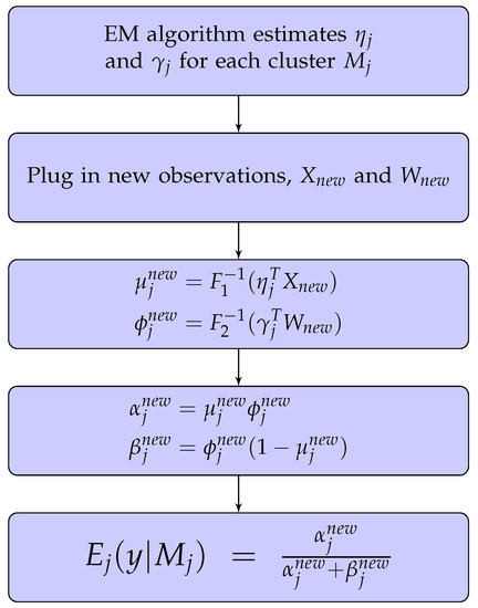 Given the beta mixture model, we need to predict the RR for new clients based on their information, i.e., and . Figure 5 shows a flowchart explaining how to calculate the estimated RR from the beta mixture model. This gives an expected value of RR y conditional on the cluster . Therefore, we need to first identify which cluster the new observation belongs to. Even though the R package “betareg” (Cribari-Neto and Zeileis 2010; Gruen et al. 2012) can compute the conditional expectation for us, it does not identify which cluster the new points should be assigned to. Therefore, we propose a method to do this. In general, there are two feasible approaches to assign a new observation to :