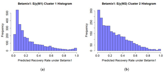 Following the procedure in Figure 5, the expected value of RR conditional on Cluster was calculated based on the parameters and estimated in Table 2. Since it was too time consuming to perform kernel density estimation on 29 variables, we reduced the dimension to six by employing PCA analysis, which greatly shortened the running time for two clusters’ density estimations. Nevertheless, it is inevitable that information is lost during the dimension reduction process, which may result in weaker estimates. Figure 6 shows histograms of expected value of RR conditional on each jth cluster for the test dataset. The shapes of the two clusters are similar, except Cluster 2 has more estimates in the range 0.2 to 0.6.