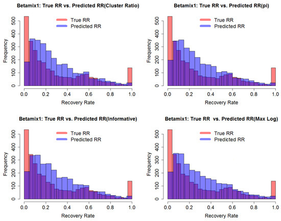 Figure 7 shows four histograms of predicted RR corresponding to the four different priors defined in Table 1, in contrast to the true RR. The predicted value of beta mixture model combined with logistic regression model was calculated by applying the formula derived in Equation (14). Models with the different priors performed in a similar way. Importantly, they were all able to model the bimodal nature of the RR. The figure shows that none of the models ewre good at predicting the extreme values of RR close to 0 or 1, but this naturally follows from the fact that these predictions are estimates of expected values of RR, through Equation (12), albeit conditional on predictor variables, and thus do not represent the extremes in the distribution well. Further detail can be seen in Figure 8, which shows predicted RR against true RR. The strong correlation between predicted and true RR is clear. However, it is noticeable that, when true RR was around 0.6, the model tended to under-estimate for some observations. This was because the model was not perfect at detecting observations in Cluster 2. This suggests future improvements to the model to enhance its capacity to predict the correct latent cluster.