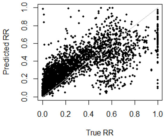 Predicted RR against true RR on test data () using beta mixture with the indifferent prior, combined with logistic regression.