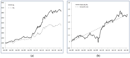 Figure 1a shows the historical levels of the wealth processes BL and NL, while Figure 1b provides the relative strength of BL over NL as well as the growth line. An increasing relative strength index signals outperformance of BL over NL, while a decreasing index shows underperformance.