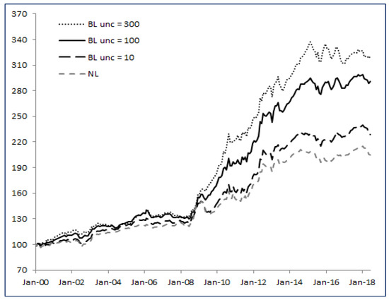 Intuitively, among the BL strategies detailed in Table 4, the strategy with is the closest to NL and this is confirmed by the performance and volatility figures. Indeed, with such a low level of uncertainty, we are confident in our initial estimate . As we increase , the confidence we place in decreases.
