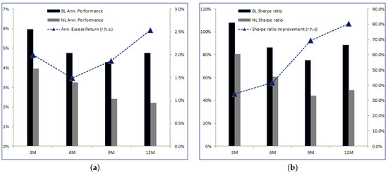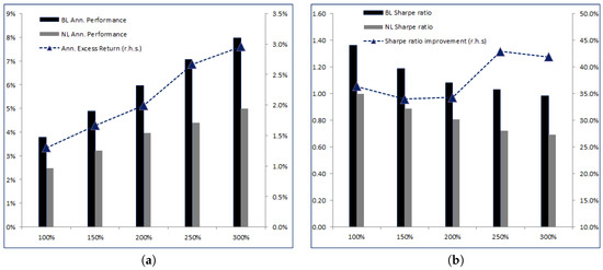 Figure 2a,b graphically renders the increase in both annualized performances, excess returns and Sharpe ratios with respect to NL as a function of .